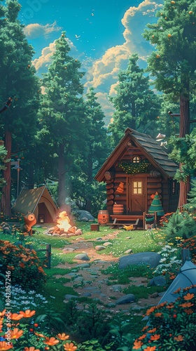 Obraz premium A tranquil forest glade with a wooden cabin, campfire, tents, and forest...