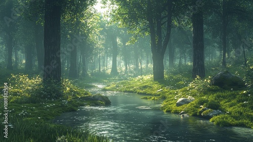 Obraz premium A tranquil forest glade with sunlight filtering softly through the tall trees, illuminating the moss-covered floor. A gentle stream winds its way through the scene, creating a calming atmosphere.