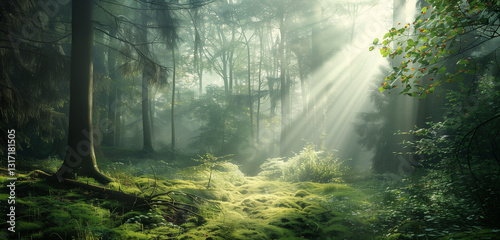 Obraz premium A tranquil forest landscape bathed in sunlight, where rays filter through the...