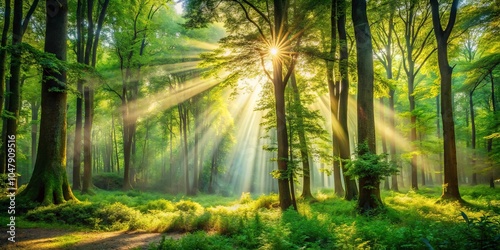 © Pluto, Naklejka premium A Tranquil Forest Path Bathed in Golden Light, Where Sunbeams Dance Through the Canopy, Illuminating the Lush Undergrowth and Evoking a Sense of Serenity