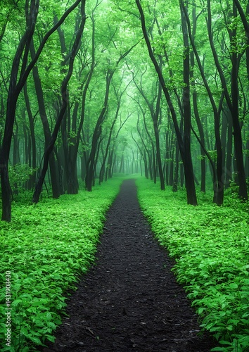 © Jamppidlaew, Fototapeta premium A Tranquil Forest Path Beckons Wandering Souls Through Verdant Woodlands and Lush