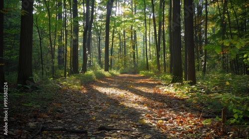 Obraz premium A tranquil forest path featuring towering trees, soft dappled sunlight, and a...