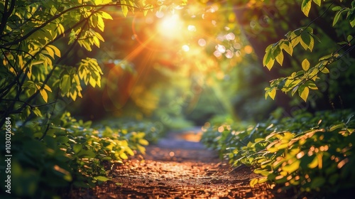Obraz premium A tranquil forest path illuminated by the warm glow of sunset during the...