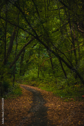 Naklejka premium A tranquil forest path in the early autumn morning, covered with fallen leaves and framed by a tunnel of deep green, overhanging tree branches.