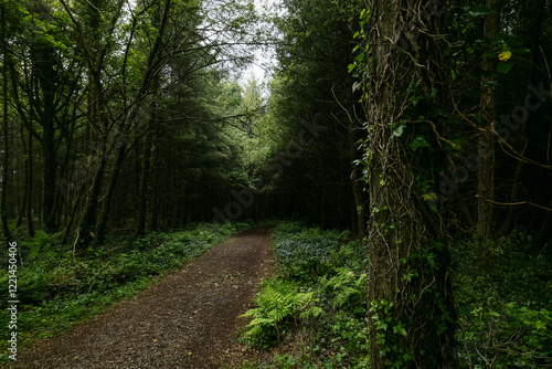 Fototapeta premium A tranquil forest path meanders through tall trees, surrounded by lush...
