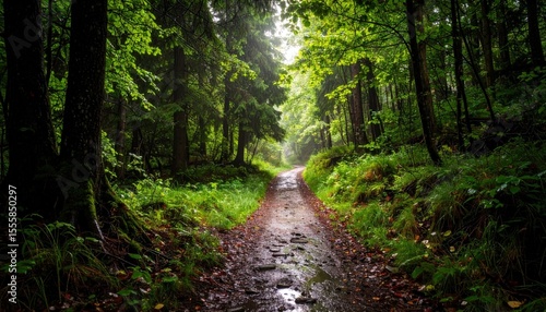 Obraz premium A tranquil forest path surrounded by lush greenery and trees, inviting nature...