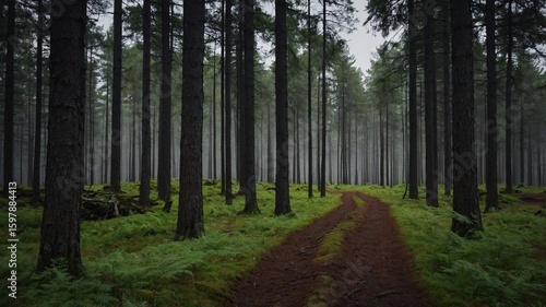 Obraz premium A tranquil forest path surrounded by tall pine trees, shrouded in mist,...