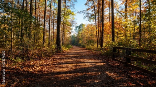 © kwangze, Fototapeta premium A tranquil forest path surrounded by vibrant autumn foliage and clear blue sky.