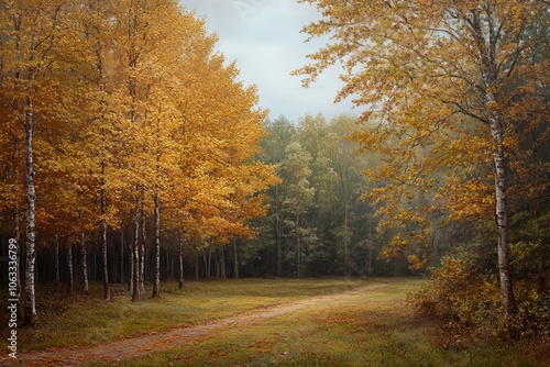 Obraz premium A Tranquil Forest Path Surrounded by Vibrant Autumn Foliage in a Serene Landscape During Early Morning Light