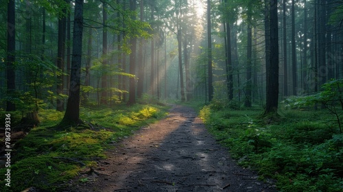 Obraz premium A tranquil forest path winding through towering trees, dappled sunlight...