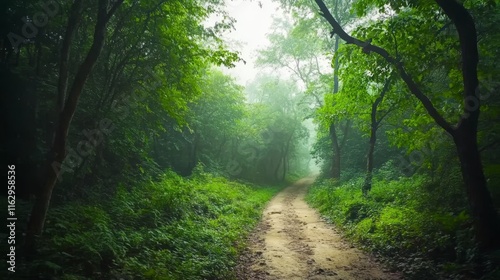 Fototapeta premium A tranquil forest path winds through dense greenery, enveloped in soft mist...