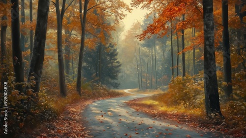 Obraz premium A tranquil forest path winds through tall trees adorned with vibrant autumn...