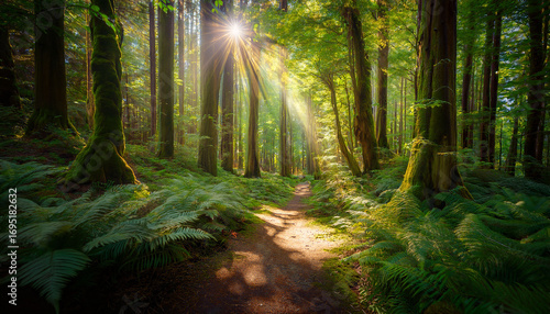 © Valen, Obraz premium A Tranquil Forest Path With Sunlight Filtering Through The Trees Illustration Background