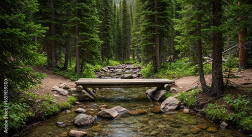 Naklejka premium A tranquil forest scene. A small wooden bridge spans a clear, rocky stream. Towering evergreens flank the path, creating a verdant tunnel