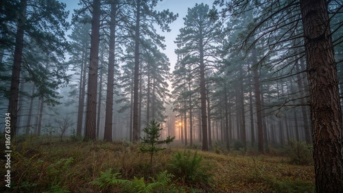 Obraz premium A tranquil forest scene at sunrise with tall pine trees and a misty atmosphere.