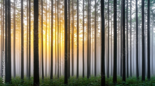 Obraz premium A tranquil forest scene at sunrise, with tall trees enveloped in mist,...
