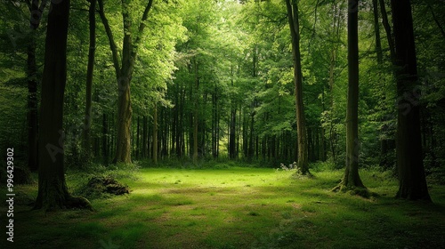 Naklejka premium A tranquil forest scene with an empty ground space surrounded by tall trees, inviting a sense of calm and connection to nature.