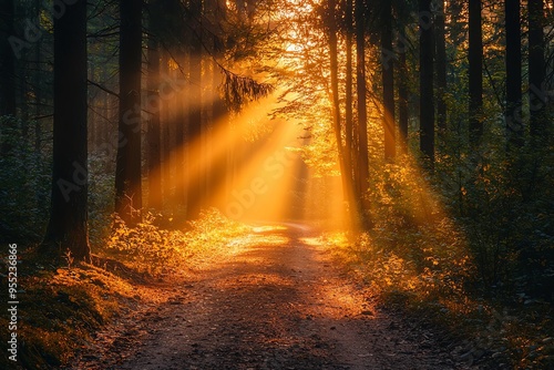 Obraz premium A tranquil forest scene with sunlight streaming through trees, creating a...
