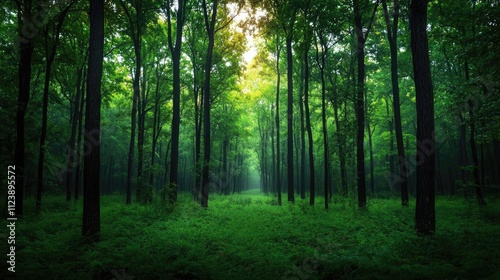 Obraz premium A tranquil forest scene with tall trees and lush greenery, embodying nature's...