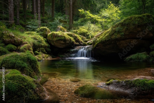 Obraz premium A tranquil forest stream cascades over mossy rocks, creating a serene and...