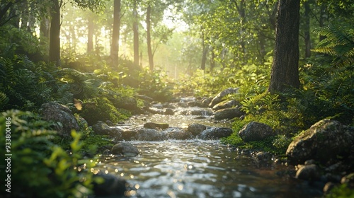 Obraz premium A tranquil forest stream flows gently through lush greenery, illuminated by...