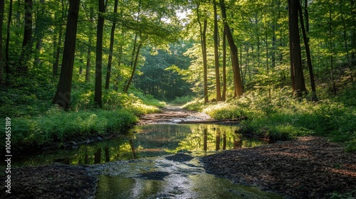 Fototapeta premium A tranquil forest stream under the summer sunlight, surrounded by dense green foliage.
