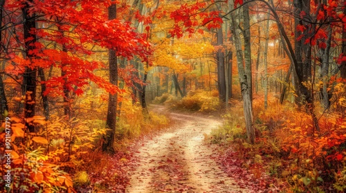 © Thirawat, Obraz premium A tranquil forest trail covered in a rich layer of fall leaves, leading through trees displaying a stunning mix of red, orange, and gold foliage.