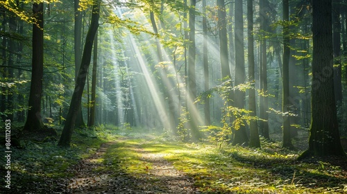 Fototapeta premium A tranquil forest trail with sunlight filtering through the trees