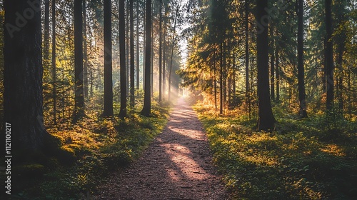 Fototapeta premium A tranquil forest trail with tall trees on either side and sunlight streaming...