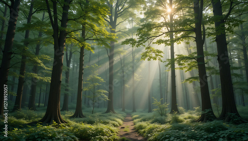© hwsky, Fototapeta premium A Tranquil Forest with Sunlight Filtering Through Trees