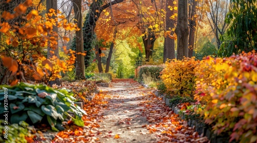 Naklejka premium A tranquil garden path covered in a vibrant mix of fall foliage, with trees...
