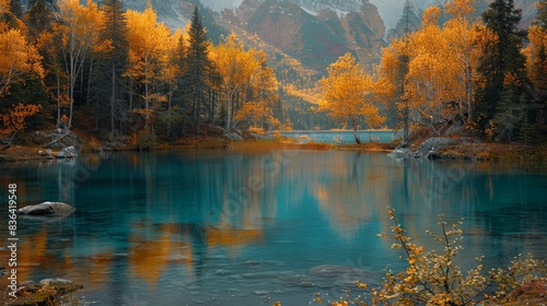Fototapeta premium A tranquil glacial blue lake surrounds a forest of fall trees in an Alaskan...