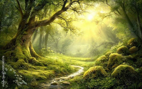 Fototapeta premium A Tranquil Green Forest With Sunlight Filtering Through Trees in the Early...
