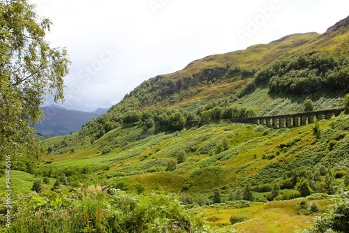 Obraz premium A tranquil, green landscape featuring a historic viaduct with arched...