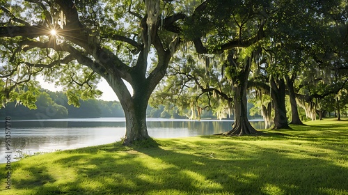 Fototapeta premium A tranquil haven beside the lake tucked up amid giant oaks