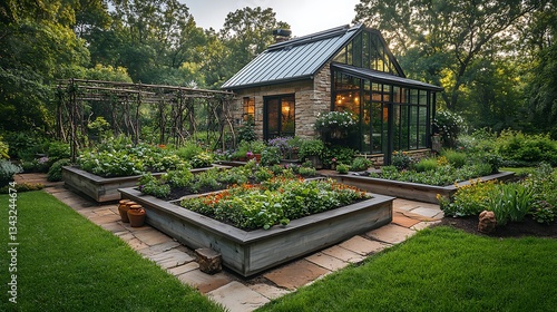 Fototapeta premium A tranquil herb garden with raised beds, trellises, and a small greenhouse for cultivating fresh ingredients