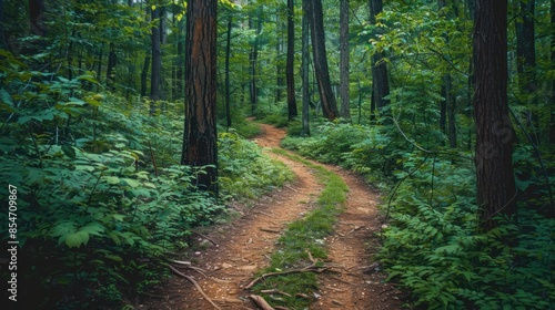 Obraz premium A tranquil hiking trail winding through a dense forest, offering a peaceful...