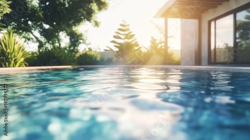 Fototapeta premium A tranquil home garden pool under natural sunlight, soft surroundings...