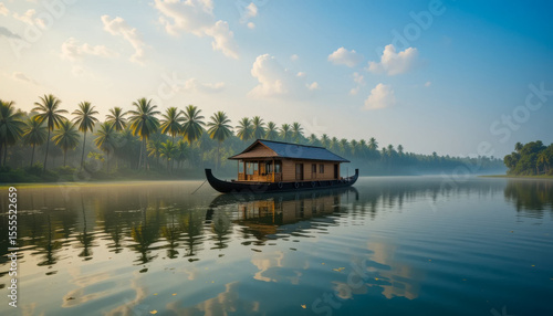 © Rajesh, Fototapeta premium A tranquil houseboat rests on a calm lagoon, surrounded by lush palm trees and a misty sunrise. The scene is peaceful and idyllic, reflecting the beauty of tropical nature.