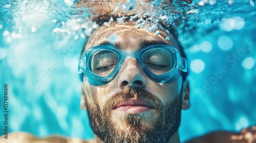 Fototapeta premium A tranquil image of a man with his eyes closed underwater, emphasizing peace...