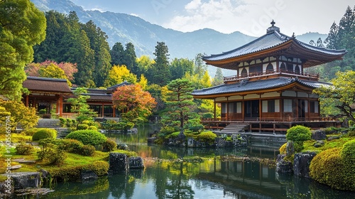 © Kitta Studio, Fototapeta premium A tranquil Japanese garden featuring a serene pond, traditional architecture, and vibrant foliage amidst majestic mountains.