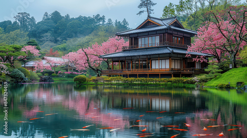Fototapeta premium A tranquil Japanese tea garden with a traditional tea house created with...