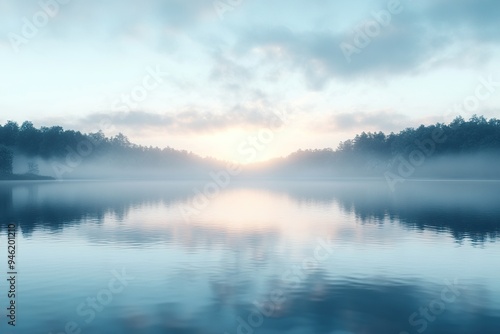 Fototapeta premium A tranquil lake at dawn, with mist rising from the water and the first light...