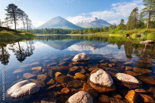 © Thammarong, Obraz premium A tranquil lake in a nature reserve, reflecting the surrounding forest and distant mountains under a clear blue sky