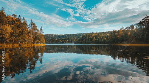 Fototapeta premium A tranquil lake reflecting a blue sky and fluffy clouds, surrounded by a...