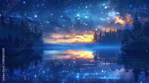 © harryaishi, Obraz premium A tranquil lake reflecting a starry night sky above a forest.