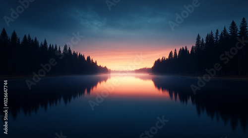 © Santri, Fototapeta premium A tranquil lake with a foggy sunrise reflected in the water, framed by trees on either side.