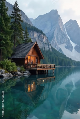 Fototapeta premium A tranquil lakeside cabin, perfectly secluded for a restful holiday getaway...
