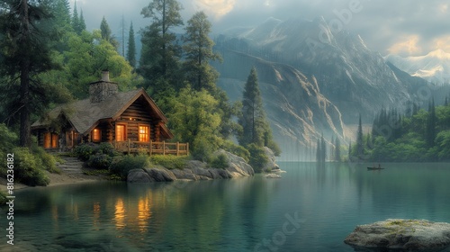 Fototapeta premium A tranquil lakeside cabin surrounded by towering pine trees, its warm glow...