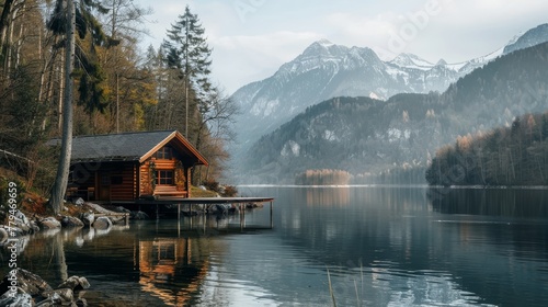 Fototapeta premium A tranquil lakeside cabin with a view of the mountains AI generated...